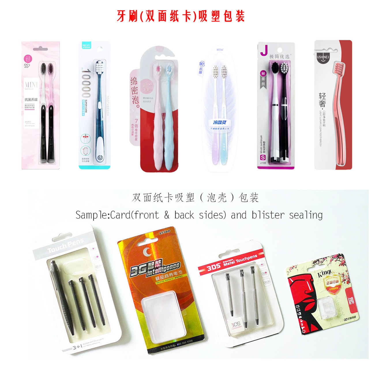 我們專業生產全自動紙塑(吸塑)包裝機,牙刷吸塑包裝機,電池掛卡包裝機,吸塑機等系列產品和多機智能聯動生產線及其相關配套設備。公司集生產、研發、銷售、售后為一體的企業。該產品適用于小五金(堿性電池、紐扣電池、膠水)、文具(卷筆刀、橡皮擦、涂改液、固體膠)、汽摩配(剎車片,雨刮片)、日用品(剃須刀、牙刷、牙線)、化妝品(唇膏,指甲刀,香水)、藥品(紅花油、風油精,)、玩具(小汽車,指尖陀螺,手表)、醫療器械、食品、等行業相關產品的紙塑包裝。